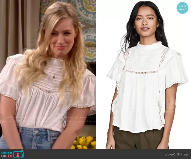 Gemma (played by Beth Behrs) on The Neighborhood on CBS was spotted wearing this white ruffled cotton top on The Neighborhood on episode 'Welcome to the Dad Band' (3x11) in Mar 2021. Gemma's Top is the Le Femme Top by Free People.