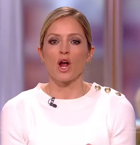 Sara Haines on The View on ABC was spotted wearing this white button shoulder sweater on The View on Mar 09 2021's episode. Sara's Sweater is the Buttoned Shoulder Jumper by L'Agence.