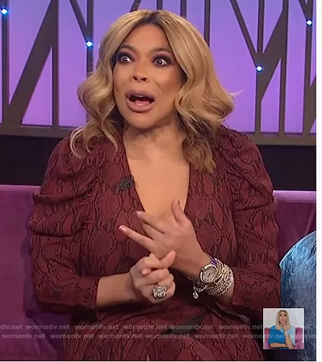 Wendy Williams on The Wendy Williams Show on Various was spotted wearing this red snake skin wrap dress on The Wendy Williams Show on Mar 09 2021's episode. Wendy's Dress is the Tianna Wrap Dress by A.L.C..