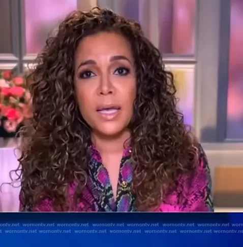 Sunny Hostin on The View on ABC was spotted wearing this pink snake skin ruched top on The View on Mar 10 2021's episode. Sunny's Top is the Ruched Python-Print Jersey Top by Versace.