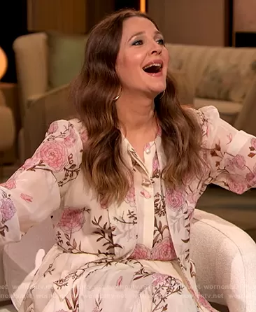Drew Barrymore on The Drew Barrymore Show on CBS was spotted wearing this pink floral blouse and skirt on The Drew Barrymore Show on Mar 10 2021's episode. Drew's Top is the Floral-Print Silk Blouse by Giambattista Valli . Drew's Skirt is the Floral Print Silk Georgette Skirt by Giambattista Valli.