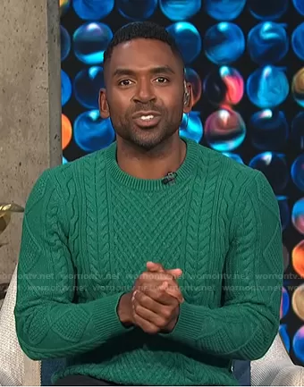 Justin Sylvester on E! News on E! was spotted wearing this green cable knit sweater on E! News Daily Pop on Oct 13 2021's episode. Justin's Sweater is the Cable-Knit Sweater by Banana Republic.
