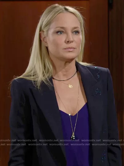 Sharon Newman (played by Sharon Case) on The Young and the Restless on CBS was spotted wearing this navy glittery blazer on The Young and the Restless on Mar 10 2021's episode. Sharon's Jacket is the Venus Strass Blazer by Zadig & Voltaire.