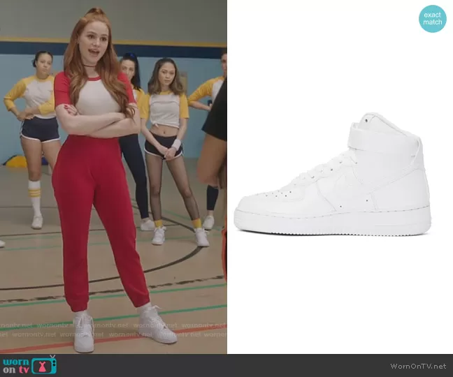 Cheryl Blossom (played by Madelaine Petsch) on Riverdale on The CW was spotted wearing this white high top sneakers on Riverdale on episode 'Fire in the Sky' (5x07) in Mar 2021. Cheryl's Shoes is the White Air Force 1 High 07 Sneakers by Nike.