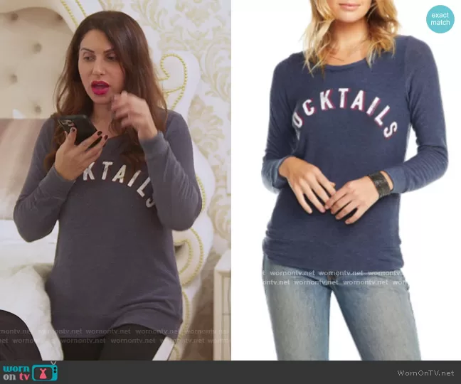 Jennifer Aydin on The Real Housewives of New Jersey on Bravo was spotted wearing this blue cocktails sweater on The Real Housewives of New Jersey on episode 'Redo and Rewind' (11x04) in Mar 2021. Jennifer's Sweater is the Cocktails Sweater by Chaser.