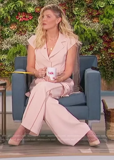 Amanda Kloots on The Talk on CBS was spotted wearing this beige belted jacket on The Talk on Mar 12 2021's episode. Amanda's Jacket is the Sleeveless Belted Jacket by Toccin . Amanda's Pants is the Piped Wide-Leg Pants by Toccin.