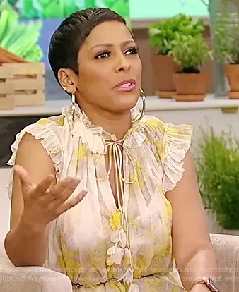 Tamron Hall on Tamron Hall Show on ABC was spotted wearing this yellow floral ruffled dress on Tamron Hall Show on Mar 24 2021's episode. Tamron's Dress is the Wild Botanica belted ruffled floral-print silk-crepon midi dress by Zimmermann.