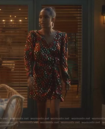 Zoey Johnson (played by Yara Shahidi) on Grown-ish on Freeform was spotted wearing this metallic floral wrap dress on Grown-ish on episode 'Who Do You Love?' (3x17) in Mar 2021. Zoey's Dress is the Metallic Rose Mini Dress by The Kooples.