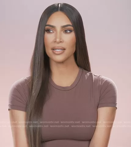 Kim Kardashian on Keeping Up with the Kardashians on E! was spotted wearing this brown tee on Keeping Up with the Kardashians on episode 'No Comment' (20x02) in Mar 2021. Kim's Top is the Stretch Cotton Tee by Skims.
