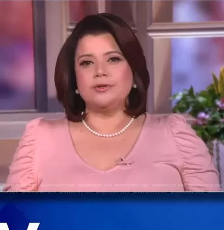Ana Navarro on The View on ABC was spotted wearing this pink shirred sleeve top on The View on Mar 19 2021's episode. Ana's Top is the Shirred Sleeve Knit Top by Eloquii.