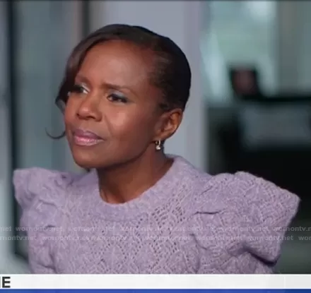 Deborah Roberts on Good Morning America on ABC was spotted wearing this lilac puff sleeve pointelle sweater on Good Morning America on Mar 19 2021's episode. Deborah's Sweater is the Novah Puff Sleeve Sweater by Veronica Beard.