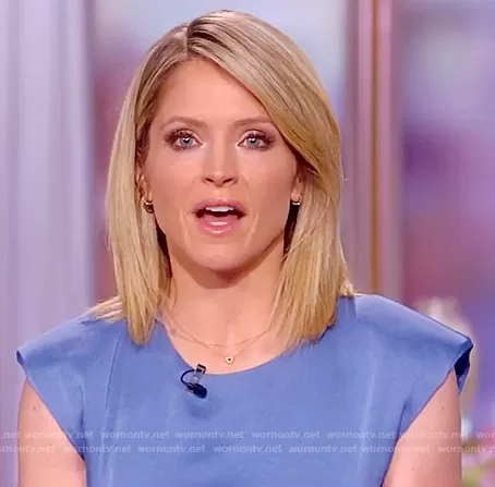 Sara Haines on The View on ABC was spotted wearing this blue sleeveless dress on The View on Mar 22 2021's episode. Sara's Dress is the Peony Sleeveless Asymmetric Dress by Veronica Beard.