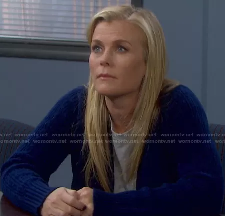 Sami Brady (played by Alison Sweeney) on Days of our Lives on Peacock was spotted wearing this blue cable knit cardigan on Days of our Lives on Mar 23 2021's episode. Sami's Sweater is the Malinka Cashmere Cable-Knit Cardigan by Theory.