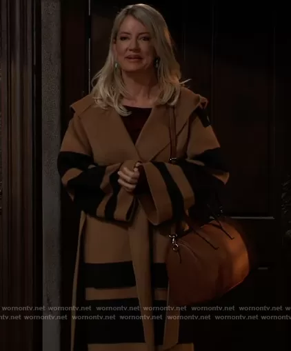 Nina Reeves (played by Cynthia Watros) on General Hospital on ABC was spotted wearing this beige stripe coat on General Hospital on Mar 23 2021's episode. Nina's Coat is the Reversible Belted Hooded Wool Blend Coat by La Ligne.