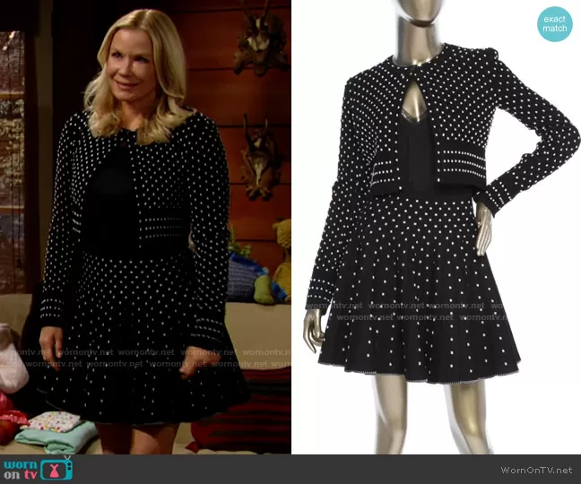 Brooke Logan (played by Katherine Kelly Lang) on The Bold and the Beautiful on CBS was spotted wearing this polka dot cardigan and skirt set on The Bold and the Beautiful on Mar 23 2021's episode. Brooke's Set is the Skirt Set by Alaia.