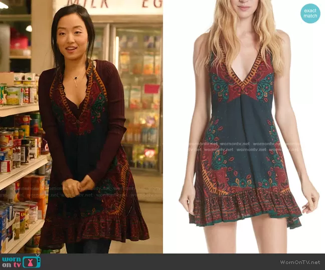 Janet (played by Andrea Bang) on Kims Convenience on CBC was spotted wearing this floral v-neck mini dress on Kims Convenience on episode 'Who's Pranking Who?' (5x10) in Mar 2021. Janet's Dress is the Steal the Sun Reversible Dress by Free People.
