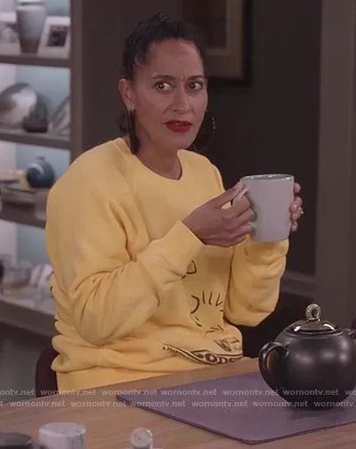 Rainbow Johnson (played by Tracee Ellis Ross) on Black-ish on ABC was spotted wearing this yellow woodstorck graphic sweatshirt on Black-ish on episode 'The Mother and Child De-Union' (7x13) in Mar 2021. Rainbow's Sweater is the Peanuts X Mens Sweatshirt by Marc Jacobs.