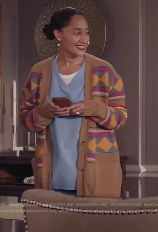 Rainbow Johnson (played by Tracee Ellis Ross) on Black-ish on ABC was spotted wearing this beige argyle knit sweater on Black-ish on episode 'The Mother and Child De-Union' (7x13) in Mar 2021. Rainbow's Sweater is the Jacquard Knit Cardigan by Alexa Chung.