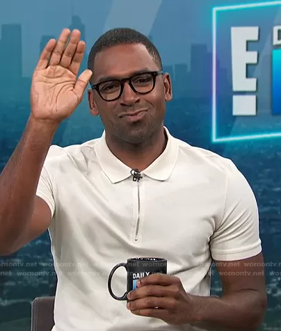 Justin Sylvester on E! News on E! was spotted wearing this white quarter zip polo shirt on E! News Daily Pop on Mar 24 2021's episode.
