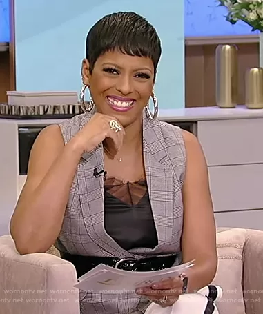 Tamron Hall on Tamron Hall Show on ABC was spotted wearing this gray plaid vest and white pants on Tamron Hall Show on Mar 24 2021's episode. Tamron's Vest is the Plaid Open-Front Wool Blazer Vest by Michael Kors . Tamron's Pants is the Cuneo striped cady wide-leg pants by Max Mara.