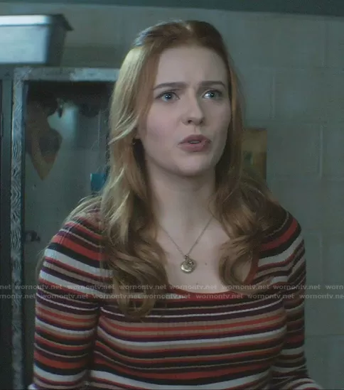 Nancy Drew (played by Kennedy McMann) on Nancy Drew on The CW was spotted wearing this multicolor striped long sleeve top on Nancy Drew on episode 'The Bargain of the Blood Shroud' (2x09) in Mar 2021. Nancy's Top is the Fitted Scoop-Neck Sweater Top by Banana Republic.