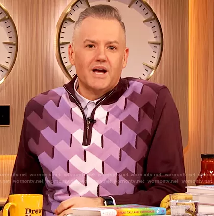 Ross Mathews on The Drew Barrymore Show on CBS was spotted wearing this purple geometric sweater on The Drew Barrymore Show on Mar 25 2021's episode. Ross's Sweater is the Ombre Geometric Front Design Sweater by Stacy Adams.