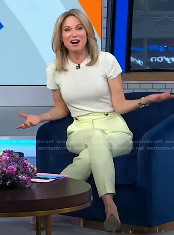 Amy Robach on Good Morning America on ABC was spotted wearing this ribbed tee and yellow buttoned pants on Good Morning America on Mar 26 2021's episode. Amy's Top is the Ribbed Knit Top by Zara