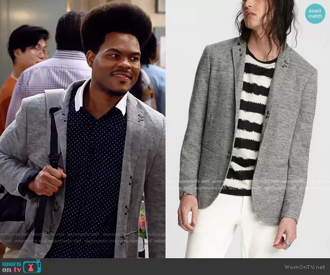 Carter (played by Julian Gant) on Call Me Kat on Fox was spotted wearing this grey hook detail knit blazer on Call Me Kat on episode 'Cat-A-Versary' (1x13) in Mar 2021. Carter's Jacket is the Hook & Bar Knit Jacket by John Varvatos.