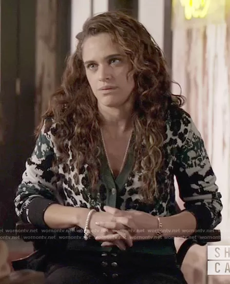 (played by ) on Batwoman on The CW was spotted wearing this green leopard print cardigan on Batwoman on episode 'Rule #1' (2x01) in Mar 2021. 's Sweater is the Leopard Jacquard Crop Cardigan by Kenzo.
