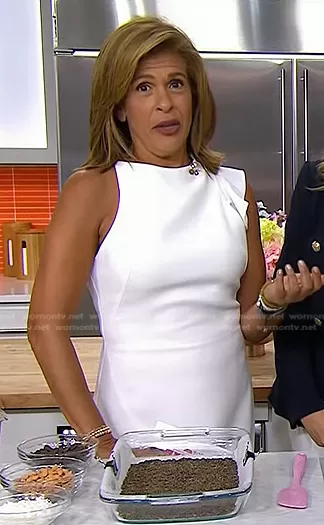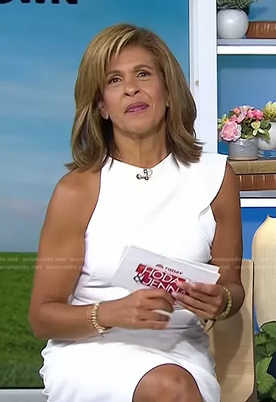 Hoda Kotb on Today on NBC was spotted wearing this white ruffle sheath dress on Today on Sep 09 2022's episode. Hoda's Dress is the Pabla Sheath Dress by Black Halo.