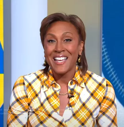 Robin Roberts on Good Morning America on ABC was spotted wearing this orange plaid shirt and skirt on Good Morning America on Mar 29 2021's episode. Robin's Top is the Checked Stretch-Jersey Top by Burberry . Robin's Skirt is the Checked Stretch-Jersey Skirt by Burberry.