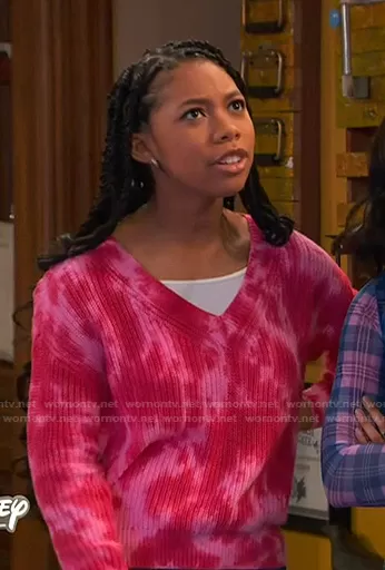 (played by ) on Ravens Home on Disney was spotted wearing this pink tie dye sweater on Ravens Home on episode 'Diff'rent Strikes' (4x09) in Mar 2021. 's Sweater is the Tie Dye V-Neck Sweater by Hiatus.