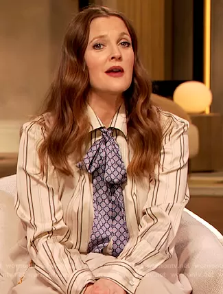 Drew Barrymore on The Drew Barrymore Show on CBS was spotted wearing this stripe blouse and pants on The Drew Barrymore Show on Mar 30 2021's episode. Drew's Top is the Adrien Satin-Stripe Boyfriend Shirt by Ralph Lauren . Drew's Skirt is the Pleated High Waisted Culottes by Michael Kors.