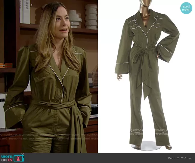 Hope Logan (played by Annika Noelle) on The Bold and the Beautiful on CBS was spotted wearing this green jumpsuit with white trim on The Bold and the Beautiful on Mar 30 2021's episode. Hope's Jumpsuit is the Yerba Jumpsuit by Johanna Ortiz.