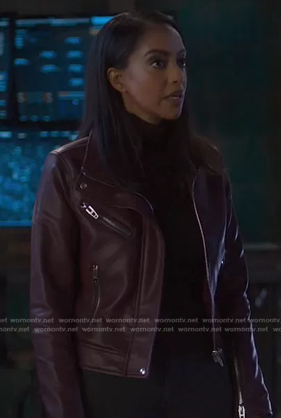 Kelly Olsen (played by Azie Tesfai) on Supergirl on The CW was spotted wearing this purple leather jacket on Supergirl on episode 'Phantom Menaces' (6x03) in Apr 2021. Kelly's Jacket is the High Collar Vegan Leather Moto Jacket in Merlot by Blank NYC.