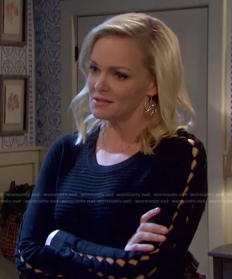 Belle Brady (played by Martha Madison) on Days of our Lives on Peacock was spotted wearing this black ribbed cutout-sleeve dress on Days of our Lives on Apr 01 2021's episode. Belle's Dress is the Rib-Knit Cutout-Sleeve Dress by Emporio Armani.