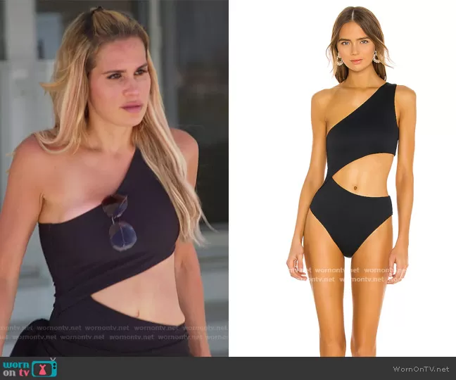 Jackie Goldschneider on The Real Housewives of New Jersey on Bravo was spotted wearing this black one shoulder cutout swimsuit on The Real Housewives of New Jersey on episode 'Old Feuds Never Die' (11x07) in Apr 2021. Jackie's Swimsuit is the Celine One Piece by Beach Riot.