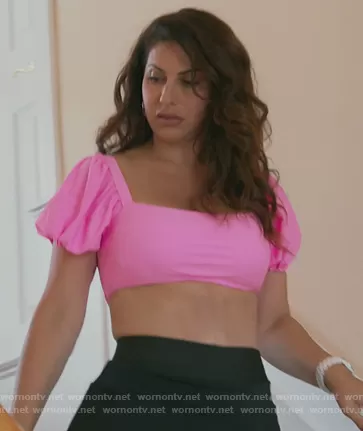 Jennifer Aydin on The Real Housewives of New Jersey on Bravo was spotted wearing this pink cropped top on The Real Housewives of New Jersey on episode 'Old Feuds Never Die' (11x07) in Apr 2021. Jennifer's Top is the Puff Sleeve Tie Front Tee Bikini Swimsuit by Shein.