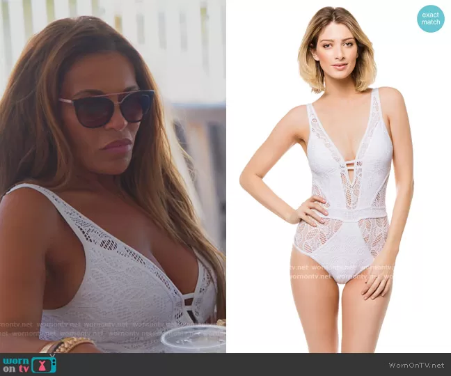 Dolores Catania on The Real Housewives of New Jersey on Bravo was spotted wearing this white lace trim swimsuit on The Real Housewives of New Jersey on episode 'Old Feuds Never Die' (11x07) in Apr 2021. Dolores's Swimsuit is the Color Play Crochet Plunge Sone Piece Swimsuit by Becca by Rebecca Virtue.
