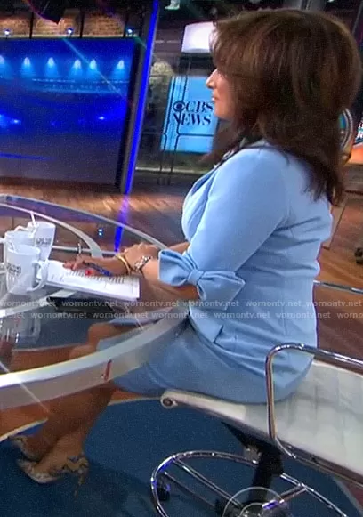 Michelle Miller on CBS Mornings on CBS was spotted wearing this blue button front dress with bow sleeves on CBS This Morning on Apr 04 2021's episode. Michelle's Dress is the Sky Blue Suit Dress by Badgley Mischka .