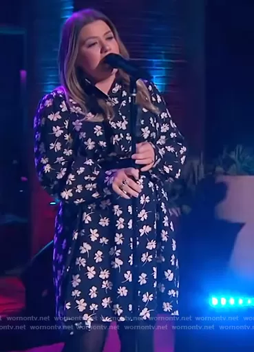 Kelly Clarkson on The Kelly Clarkson Show on NBC was spotted wearing this black floral print dress on The Kelly Clarkson Show on Apr 05 2021's episode. Kelly's Dress is the Belt printed dress by Mango.