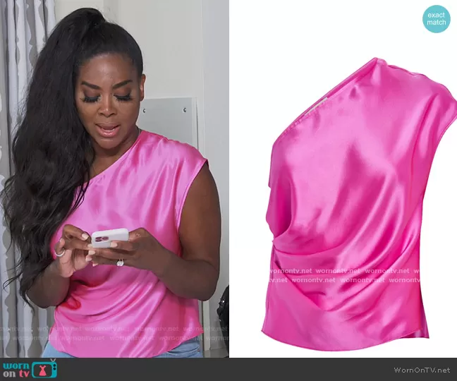 Kenya Moore on The Real Housewives of Atlanta on Bravo was spotted wearing this pink satin one shoulder top on The Real Housewives of Atlanta on episode 'Hurricane Housewives' (13x16) in Apr 2021. Kenya's Top is the One Shoulder Top by Michelle Mason.