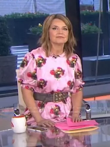 Savannah Guthrie on Today on NBC was spotted wearing this pink floral dress on Today on Apr 05 2021's episode. Savannah's Dress is the Floral Smocked Dress by Adam Lippes.