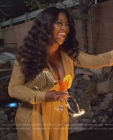 Kenya Moore on The Real Housewives of Atlanta on Bravo was spotted wearing this gold metallic wrap dress on The Real Housewives of Atlanta on episode 'Hurricane Housewives' (13x16) in Apr 2021. Kenya's Dress is the Wrap-effect metallic crochet-knit wide-leg jumpsuit by Missoni.