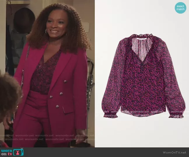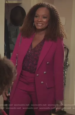 (played by ) on Kenan on NBC was spotted wearing this pink blazer and blouse on Kenan on episode 'Kenan's Mom' (1x07) in Apr 2021. 's Top is the Antonette ruffled floral-print silk-chiffon blouse by Veronica Beard . 's Blazer is the Matteo Dickey blazer by Veronica Beard . 's Pants is the Gamila high waist slim trousers by Veronica Beard . 's Bag is the Rainbow Shop Kensington Leather Crossbody Bag by Kurt Geiger London . 's Shoes is the Pierra rainbow leather heeled sandals by Kurt Geiger.