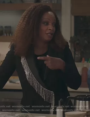 (played by ) on Kenan on NBC was spotted wearing this black embellished fringe blazer on Kenan on episode 'Kenan's Mom' (1x07) in Apr 2021. 's Blazer is the Clarise crystal-embellished crepe blazer by Veronica Beard.