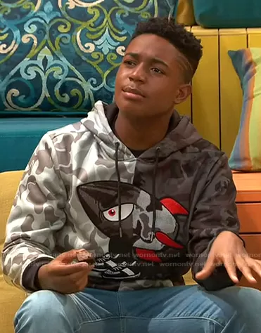 Booker Baxter (played by Issac Ryan Brown) on Ravens Home on Disney was spotted wearing this grey rocket camo hoodie on Ravens Home on episode 'Fresh Off The Note' (4x10) in Apr 2021. Booker's Sweater is the Dark Rocket Hoodie by Reason.