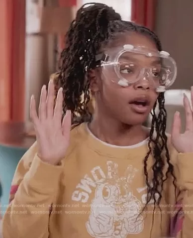 Diane Johnson (played by Marsai Martin) on Black-ish on ABC was spotted wearing this yellow Secrecy sweatshirt on Black-ish on episode 'Jack's First Stand' (7x15) in Apr 2021. Diane's Sweater is the Sworn To Secrecy by Mother.