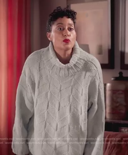 Rainbow Johnson (played by Tracee Ellis Ross) on Black-ish on ABC was spotted wearing this green chevron knit turtleneck sweater and skirt on Black-ish on episode 'Jack's First Stand' (7x15) in Apr 2021. Rainbow's Sweater is the Misura Sweater by Rachel Comey . Rainbow's Skirt is the Plano Skirt in Light Green Chunky Chevron by Rachel Comey.