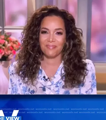 Sunny Hostin on The View on ABC was spotted wearing this white floral belted blouse on The View on Apr 07 2021's episode. Sunny's Top is the The Jannah belted floral-print silk-satin blouse by The Vampires Wife.